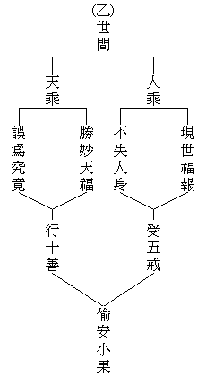 正因为众生根性不等,所以才有五乘的差别。五乘里面分为世间跟出世间:世间是不超越六道轮回,在六道之内;出世间是超越六道轮回。世间有两种:一种是‘人乘’,一种是‘天乘’。