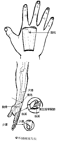 4、落枕:左边落枕按揉左悬钟,右边落枕按柔右悬钟或按压落枕穴及后溪穴,并以推揉法,推揉头部疼痛部位。若懂得整脊法,再将颈椎复位更佳。