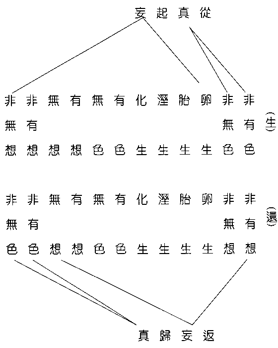 以上四相。乘世界因相而成。相待轮回。即前文生力发明义。相引轮回。即前文熏以成业义。合妄轮回。即前文同业相感义。怨害轮回。即前文相灭相生义。由此因义已成。接前胎卵等四。即世界现生相也。有色等四。即世界未来相也。以是可知。卵胎湿化。因于非有色等四。非有色等四。又因于有色等四。有色等四。又因于卵胎等四。是为前文声香味触。穷十二变。为一旋复。乘此轮回颠倒相。是有十二类生也。观此十二类生。似无终始。若依凡夫。则以非有色非无色为始。以有想无想为终。是故凡夫修行。返妄归真。首断妄想。即非有想。非无想。不从非有色非无色断起者。以非有色非无色。是凡夫真因。非可断。亦无由断故。乃至有想无想断时。妄心顿歇。则非有色非无色二生。复成是有所有。若自度住此不进。则名小乘涅槃。若自他俱度。至此则名十回向菩萨。若更向前进。即为登地菩萨。将此有所有融通。复成毕竟无。是为等觉。复以金刚智。断前所断之无相尽。是为成佛。此有所有。本是真如。因分而成妄。灭妄故。还成真。是故本经前文说。众生十类。即依还灭说也。此说十二类。乃依生起说也。金刚经云。若卵生。乃至若非无想。我皆令入无余涅槃。其中无非有色。非无色二类。即从还灭而说也。或云。十类者。除空散消沉。与精神化为土木金石二类。非。空散消沉。即以空散消沉为生。非不生故。土木金石。亦以土木金石为生。非不生故。又空散消沉。是无色类。土木金石是无想类。经除非有色。非无色二类。彼除与经文不同。是未了十类与十二类不同之要点也。