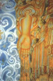 八尺长,近四尺宽的像,平放画时,站这一头就画不到那一头,趴伏在木板上的姿势,本就是对腹中肿瘤的大考验,斗室狭窄,一板平放,就交通阻塞,多须从木板下钻到对边去,动作虽然喘晕,却也乐趣盎然。珍惜这和佛亲切面对面的时光吧,五浊尘扰里,有太多的因缘会让我们忘失了觉悟和慈悲,然而不管走到天涯海角,不管遭逢天灾人祸,总有一双慈眼在关怀注视我们。向心灵深处去寻觅这双慈眼吧,心灵深处那不转的慈眸一直在守望。