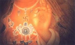 当末学行动不很灵光的时候,自己爬上爬下去画在上空的曼陀罗花,以及画佛陀的身光,家师慈悯,看了很担心末学的安全,就特请祥师慈悲的照顾末学,扶末学登高,在下面帮助末学传递颜料、叠箱子;还有把一块八尺长、四尺宽的厚木板,随须要立直或平放著……等等,这些辛苦的动作,都是由她来承担。整幅佛像,是由喷笔‘零点二公厘’的小孔里,把颜料喷出来而画成的。只要这小孔有一点阻塞,喷画就没有办法进行,所以将喷笔清洗得非常干净,是一件十分重要的工作,这也让末学体会到‘清净的心,是最重要的。’假如喷笔管不干净,就无法画佛。有一点堵塞就会爆喷!