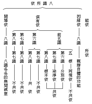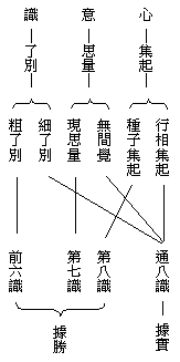 (八)阿赖耶识:阿赖耶识是梵语,华言藏识,有能藏、所藏、执藏三义。能藏即第八识能含藏前七转识诸法的种子;种子是所藏,第八识即名能藏。所藏即由前七转识熏习诸法的种子在第八识中;诸法是能藏,第八识即名所藏。这就是约第八识的受熏义边名所藏,约持种义边名能藏。执藏即第八识恒常被第七末那爱执为自内我体,故名执藏。由第八识具有三藏的功能,所以第八得名藏识。