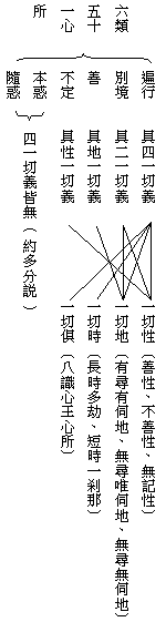 触等五个心所,周遍行起于一切心,故得名遍行。即凡有心起时,无论是那一个心王生起,这五个心所都与它相应俱起。因为这五个心所,具遍四一切为所行故。‘四一切’即一切性、一切地、一切时、一切俱。性谓善、恶、无记三性。地即有寻有伺地、无寻唯伺地、无寻无伺地,或总取九地。时即凡是有心起时,此五皆与心王同一刹那缘境。俱即遍诸心王,与八识俱生。别境五数,唯具通三性与九地二义,然阙后二。善十一但遍九地,性、时、俱三义均阙。不定四唯具一切性,余三义俱缺。根本烦恼与随烦恼,四义皆无。如表(表六):