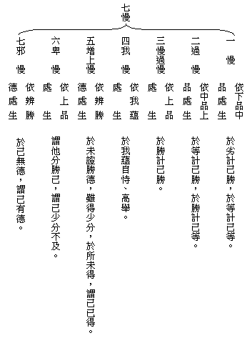 这第七末那的差别,略有三位:(1)人我见相应位,通一切异生相续。二乘有学、七地以前一类菩萨(除二乘无学、回心菩萨)有漏心位,彼第七缘阿赖耶识起补特伽罗我见,即一切有漏心,皆是此位。(2)法我见相应位,通一切异生、声闻、独觉相续(有学无学),及一切菩萨法空智果(法空智即法空无分智,果即法空后得智和法空智引起的灭尽定)不现前时,彼法执心缘异熟识起法我见,皆是此位。(3)平等性智相应位,通一切如来相续。菩萨见道(必证二空故)及修道中法空智果现在前时,彼智缘无垢、异熟识等(一切有为及真如),起平等性智,皆是此位。立表如下(表三):