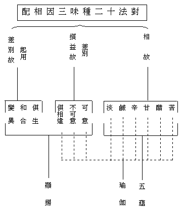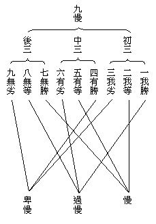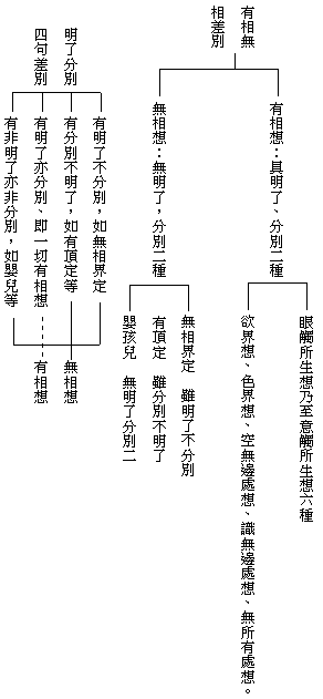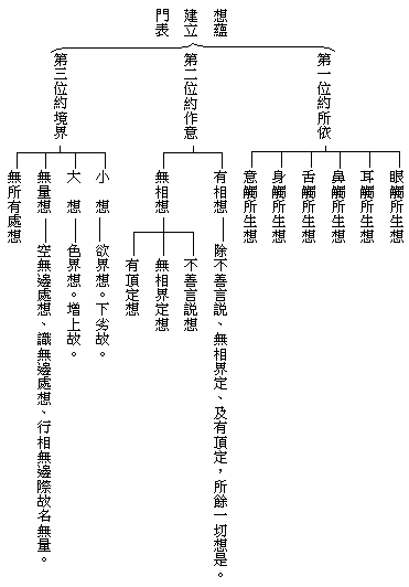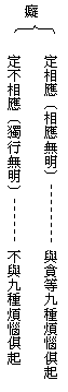 (三)无色界:无明支中,唯有胜义愚,有覆无记性。行支中,唯有不动行,唯有意业。识支,唯是化生天趣。名色支中,唯有名无有色。名中又无五识。六处支中,唯有意处。触支中,唯有俱相违触。受支中,唯有舍受。爱支中,唯有有覆无记性。取支中,概摄一切烦恼,在根本烦恼中,唯有九种,除去嗔心。随烦恼中,除小七(忿、恨、覆、恼、嫉、悭、害)中二(无惭、无愧)是不善性,唯欲界有故。诳、谄通欲界及初禅,憍及大八通三界。故随烦恼中,唯有憍及大八。有及生老死,准色界可知。
