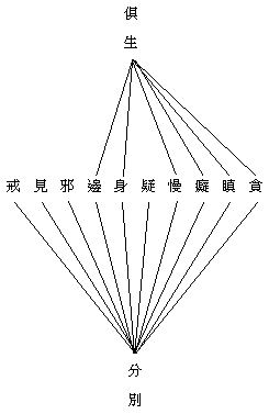 九、取支,《十地经》等说爱增名取,体即是贪。由爱为缘,于三界贪著,由是贪心发展增盛。复生起欲取、见取、戒禁取、我语取,是为取支。于诸欲所有欲贪名欲取,三界中的见取名见取,三界中的戒禁取名戒禁取,三界中的身见名我语取。所执的我无有实体,唯有我名的空语,故名我语取。据实而论,取支通取一切烦恼,《瑜伽论》说:一切烦恼令生相续故,即通见修所有烦恼令生相续。《十地经》等虽说爱增名取,是约爱润胜说,非无余惑。此通取种现为体。