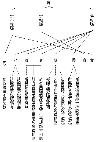 (1)信:于实德能,深忍乐欲,心净为性;对治不信,乐善为业。‘忍’即胜解,是信的因;‘乐欲’即欲心所,是信的果。由对于诸法真理和三宝功德忍可为因,才生起深厚信乐和希望欲得成就的乐欲果法故。这信的体性澄清,能清净心心所等,如水清珠,能清浊水,故信体自净,亦清净他。但因为心体殊胜,所以论中唯说心净为性。有这净信,就能对治不信,爱乐修证世出世间的善法,所以论说乐善为业。这信的差别,略有三种:[1]信‘实’有。即对于一切法的实事和空理,深信忍可为有。就是‘忍’义。[2]信有‘德’。即对于佛法僧三宝具有的真实清净的功德,深信为有,生起爱乐。就是‘乐’义。[3]信有‘能’。即对于一切世出世间的有漏无漏善法,深信自己及他人,只要肯精进的学习,都能获得和成就,因而生起希望能得能成的善法欲。就是‘欲’义。若连信的依处业用加在一起来说,则解信的文句共有五义:[1]‘于实德能’,是说信的依处。[2]‘深忍乐欲’,是说信的因果。[3]‘心净为性’,是说信的体性。[4]‘对治不信’,[5]‘乐善为业’两句,是说信的业用。