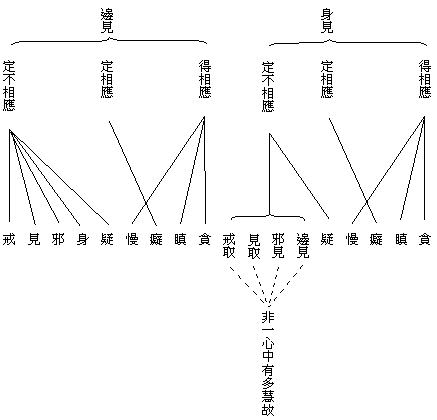 (2)八识分别。别境五所,与因位第八识,全不相应:以第八任运缘境,故无有欲;行相盲昧,故无胜解;恒缘任运现境,故无有念;任运刹那别缘,故无有定;行相微昧,故无简择。若在果位,五所全得相应:常乐证知所观境,故有欲;于所观境恒印持,故有胜解;于曾受境明记,故有念;世尊无不定心,故有定;于一切法常抉择,故有慧。第七识在因位,唯与别境中慧心所相应,我见即染慧。故为什么不与欲等四法相应呢?以第七识缘遂合境,无所希望,故无有欲;无始以来,恒缘定事,经所印持,故无胜解;恒缘现所受境,无所记忆,故无有念;任运刹那别缘,不深趣求专缘一法,故无有定。若在果位,别境五所都与相应,义如第八果位所说。前六转识,无论在有漏无漏位皆欲等五所相应无违。