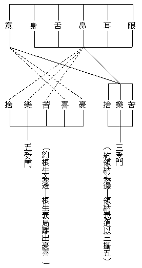 十三、三受俱起门:十二支中,依当来生起位,有十支与乐受舍受俱起。此中除去受支及老死支,以受不与受相应,是自体故。这是约一识说,若约多识来说,即得随与受俱起。老死位中,多分无乐,及客舍(非说第八主舍亦无)故,所以除去。十二支中,除受支外,有十一支与苦受相应。受不受俱起故。