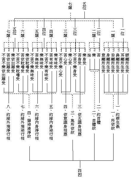 七、受支,受也是遍行心所之一,以领纳为性。由触为缘,于顺乐诸根境界生起适悦受,名乐受;于顺苦诸根境界生起逼迫受,名苦受;于顺不苦不乐诸根境界,生起非苦非乐的舍受。此有无明触所生受,与明慧触所生受两种差别,唯依无明触所生受立以为支,明慧所生受,非流转法故。