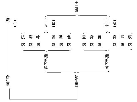 五、色非色门:十二支中,无明、识、触、受、爱、取六支,唯是心法,不通色法。其余六支,通色心二法。行支通三业,意业是心法,身语二业是色摄。名色支总括五蕴,心色全具。六处支通二蕴,五根名色蕴,意处即识蕴,行等六支,转名有支,故有通色非色。五蕴现行名生支,五蕴衰变名老,五蕴坏灭名死,故生老死皆通色心。