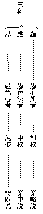 (2)三位:这第八识,从凡夫发心到圆证佛果,由于断证有异,因此第八识的名义亦有三位的差别:一、我爱执藏现行位。即七地以前菩萨、二乘有学、一切异生,从无始来,名阿赖耶,此云执藏。至无人执位,这阿赖耶的名称就舍掉了。二、善恶业果位。即从无始至金刚道时,乃至二乘无学位,名毗播迦,此云异熟。至无所知障位,第八纯善无漏,这异熟识的名称也就舍掉了。三、相续执持位。即从无始乃至如来,尽未来际利乐有情位,名阿陀那,此云执持。执持种子根身等,永无弃舍。总起来说,七地以前的菩萨,二乘有学圣者,及一切异生,这第八识的三名完全具有。菩萨八地以上和二乘无学,我执伏灭永不现行,阿赖耶的名称便舍去了,只有后二位的名称存在。到了佛果位,二障种习都已永尽,刖只有阿陀那一名存在了。这里把三位的宽狭立表如下(表四):
