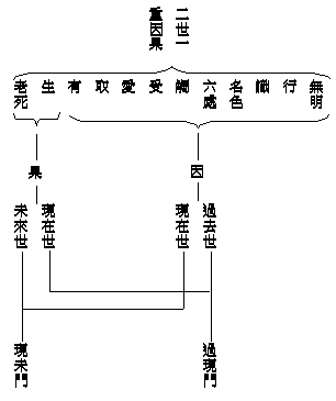 《大乘唯识论》中,于十二有支唯立二世一重因果。十二支中,前十支是因,后二支是果,这前十因支,与后二果支,定不同世。以十二有支是约分段生死的异熟因果来说的,异熟因非造业之身即可受果。既然异熟因果是约有情身生死以为世,故因果支定不同世。以造因时非即受果时故。亦非现业得果可以是十二支故,但十支因中,前十支与爱、取、有三支,可以异世,可以同世。若顺生受的业(即下一生)其世必同;即现世身中由无明发业,熏成