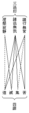 这三法印,是苦集灭道四谛变相的收摄,诸行无常,是苦谛;其生苦之因即集谛;涅槃寂静即灭谛;其证灭之因即道谛。无我则贯通四谛。如《大智度论》二十二卷说:‘佛说三种实法印,广说则四种,略说则一种。无常印是苦谛、集谛、道谛说。无我则一切法说。寂灭涅槃,即是灭谛。’立表知(表四十八):