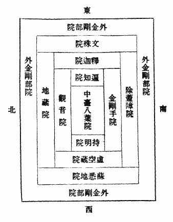 胎藏界之十三大院,中台为八叶莲。大日如来,住中台。无量寿宝幢开敷华天鼓四佛,文殊观音弥勒普贤四菩萨,住八叶,合有九尊。八叶莲华,表象生八瓣肉团心,示阿字本不生,显一切众生悉有佛性之理趣。此院为胎藏曼荼罗之总体,他十二院其别德也。第二上方遍知院,表诸佛遍知之德与诸佛能生之德,此院有七尊。第三北方观音院,表如来大悲下化之德。第四南方金刚手院,表大智上求之德,各有三十三尊。第五下方持明院,表折伏摄受二德,有五尊。第六上方释迦院,表方便摄化之德,智悲二德,变现为释迦如来,济度众生,有三十九尊。第七南方除盖障院,表由金刚之智门,除众生之盖障。第八北方地藏院,表由观音之悲门,救九界之迷情,各有九尊。第九下方虚空藏院,表悲智合一,包藏万德,能从众生愿授一切宝,兼智德,德为本,有二十八尊。第十上方文殊院,表大日之智慧,能断一切戏论,兼福德而以智德为本。金刚手院,虽为大智之德。然彼为本有之智,实相之智。此为修生之智,观照之智,有二十五尊。第十一下方苏悉地院,苏悉地,译云妙成就,表自他二利成就之德。有八尊,第十二外金刚院,表随类应化之德与圣凡不二之理,有二百零五尊。现图略十三四大护院。此中中台佛部,观音院莲华部,金刚手院金刚部,遍释文持虚苏六院属佛部,地属莲华部,除属金刚部,外金刚属三部。胎藏曼荼罗,亦有从果向因从因至果及三轮身义,准上可知。兹图示胎藏界十三大院如图。