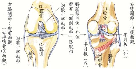 ┌人体最长的大腿骨‘股骨’(1) 膝关节是连接│ └───和第二长的‘胫骨’(2) 尚有一块会活动的膝盖骨(‘膑骨’)(3) 因股骨—胫骨之间有相当空隙(关节腔大) ┌前十字韧带┐(4) 又有关节内的韧带│ │ └后十字韧带┘(5) 故膝关节可作相当大幅度的曲伸运动,另在胫骨这边,有纤维软骨的‘半月板’衬垫保护。 |