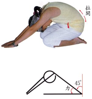 2、坐定,‘丹田’向下使力,使上身略向前倾45°。(注意非上身载力)(上身松柔软)。
