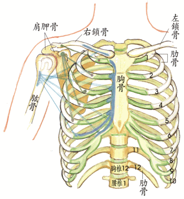 ·此图是以简单‘蓝线条’,代表‘肌肉’,表现出由‘胸部’(锁骨、胸骨、肋骨),连到‘上臂’的肌肉以及由‘肋骨’连到‘肩胛’的肌肉。