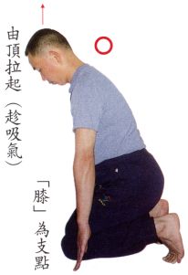 因下一个动作是翻脚准备起立,此动作之支点是在‘膝盖’,故双手若先收到膝旁时,则头、肩、手整个上身,重量也正好会落在膝盖间。如此,重心稳固(一心、无二心),全身方可轻松、灵活翻脚。